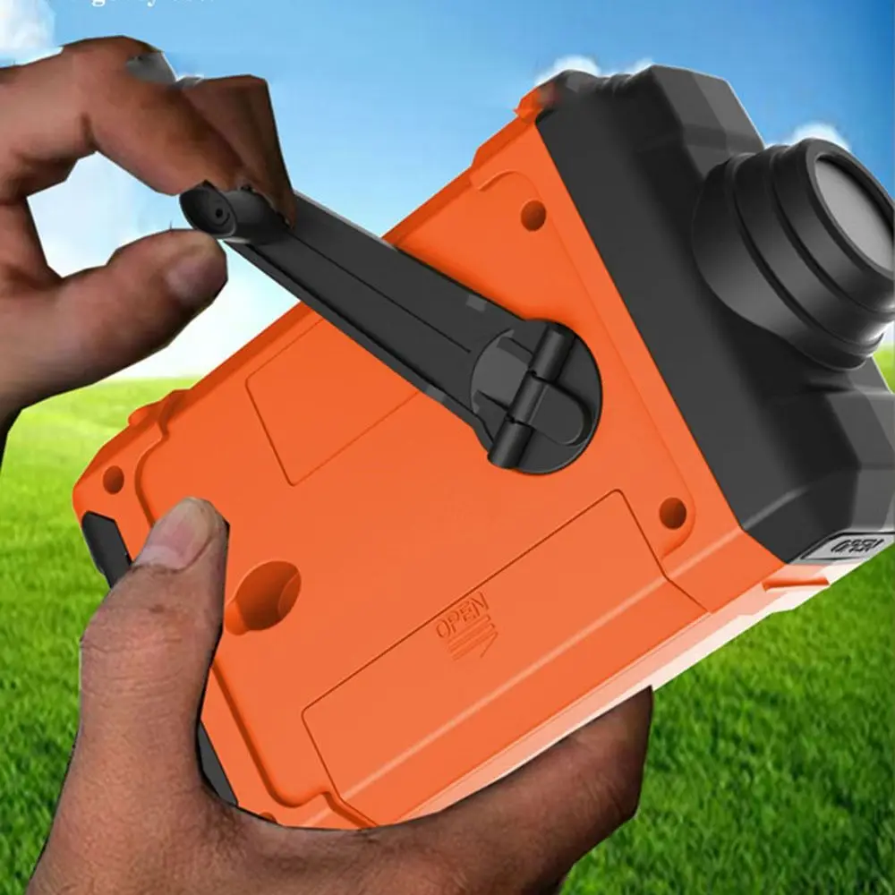 Four charging methods:Hand crank, solar panel, lithium battery, 3AAA dry battery (not included)