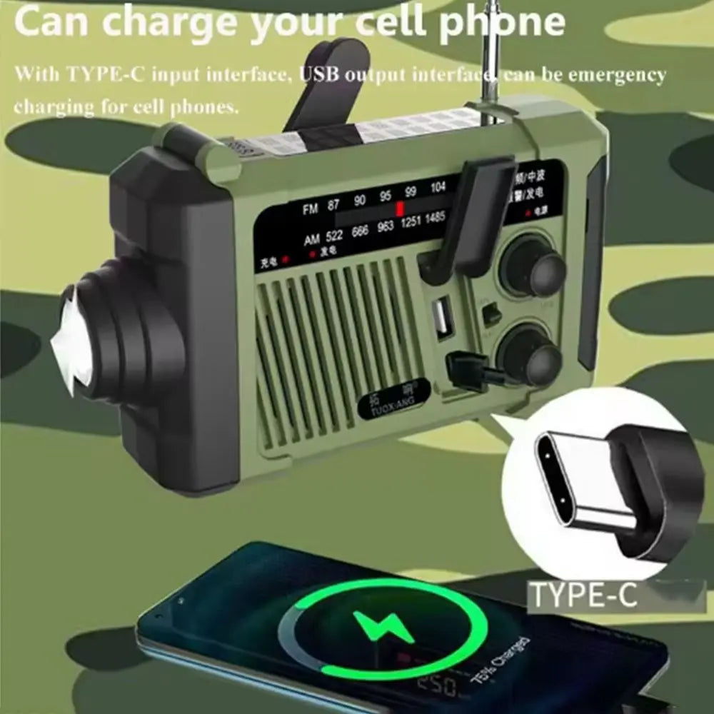 Functions: FM AM, flashlight, reading light, SOS alarm, hand-cranked power generation, solar panel charging, charging cell phone.